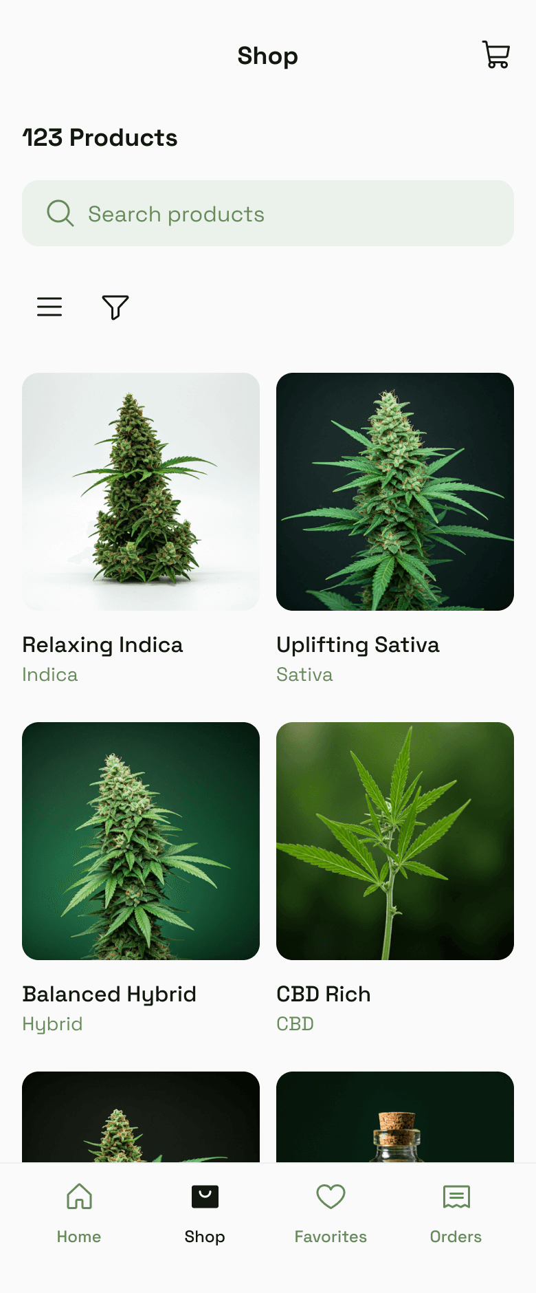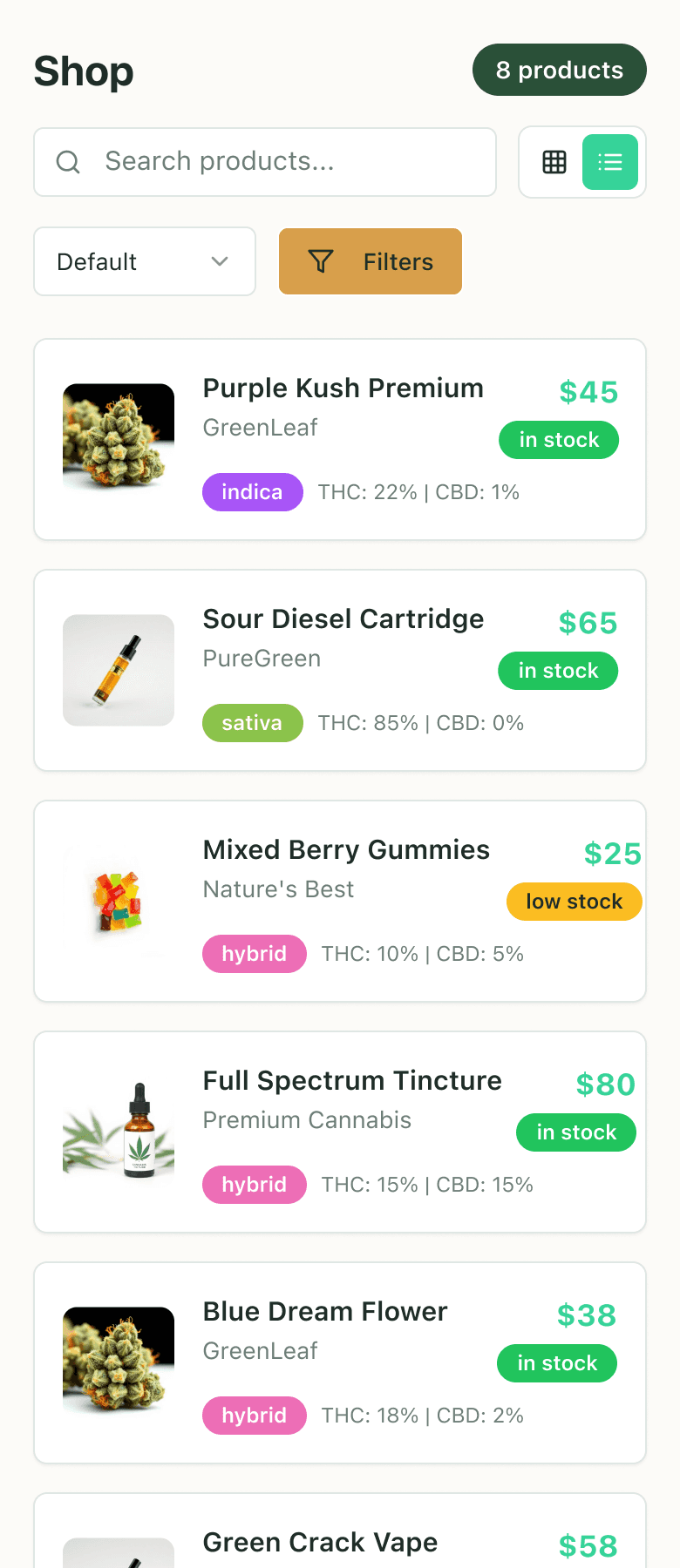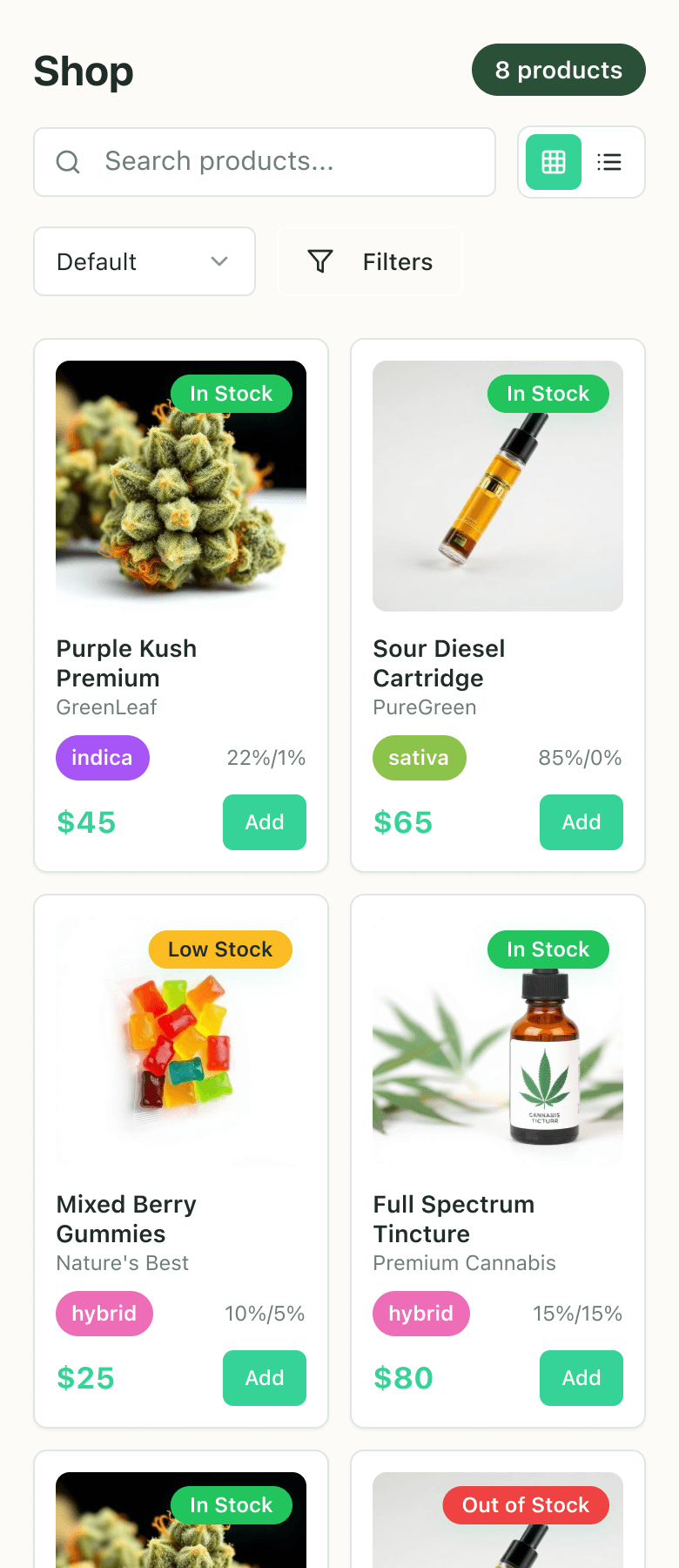 ❌ Missed all the requested details on the product cards (THC/CBD %, availability, add-to-cart buttons)