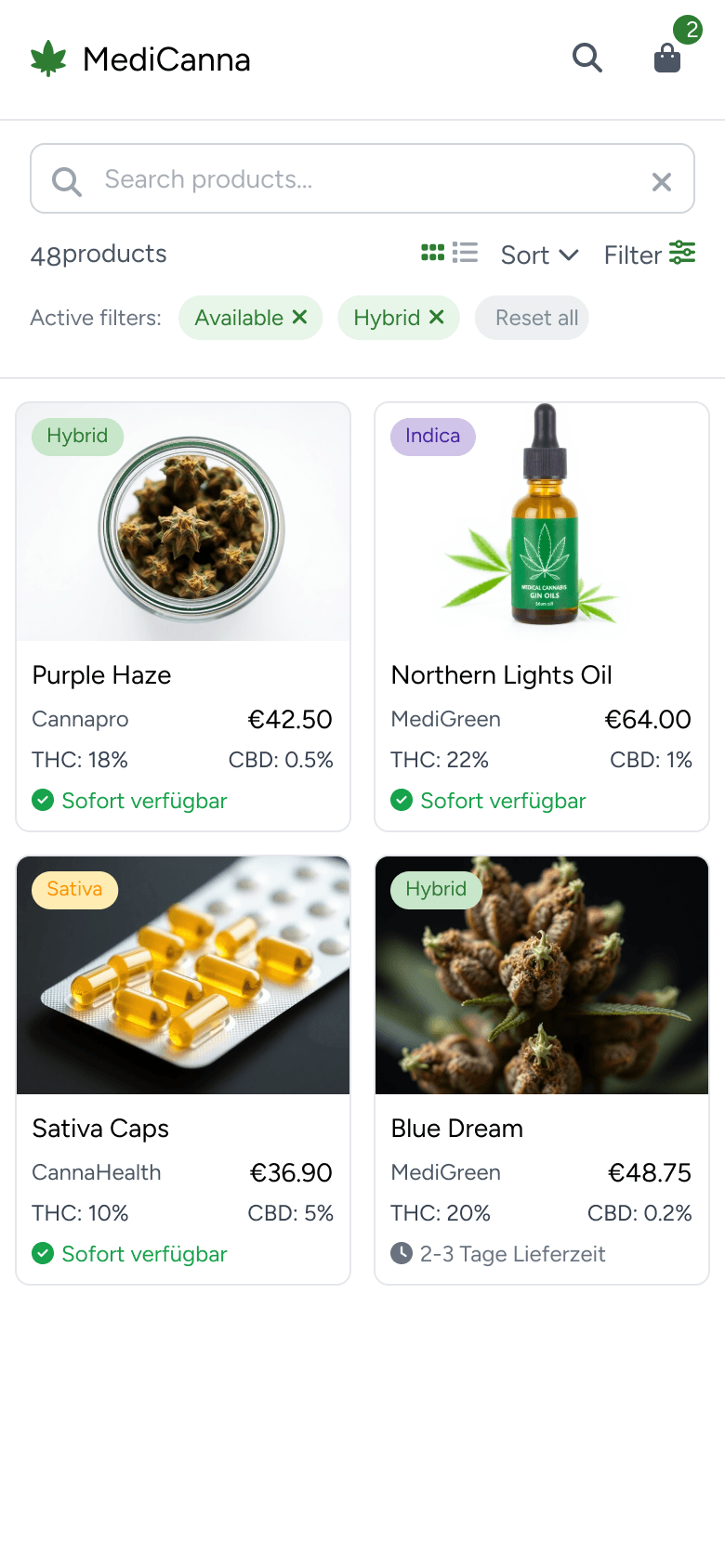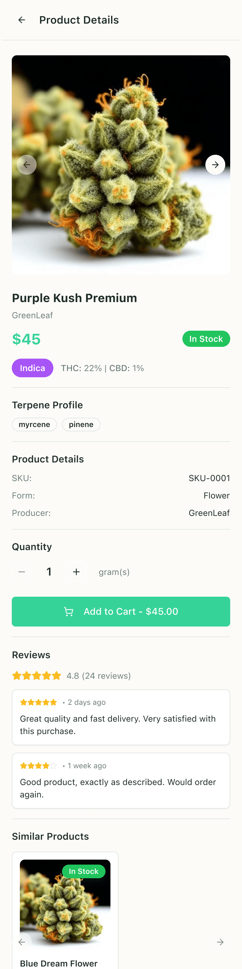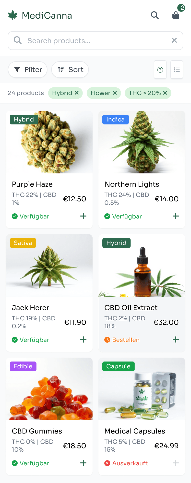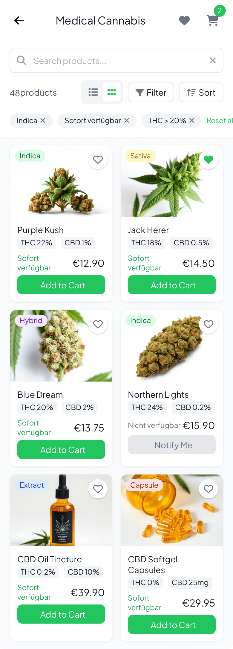 ❌ Missed all the requested details on the product cards (THC/CBD %, availability, add-to-cart buttons)